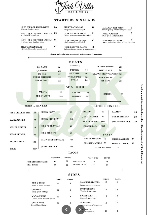 At Jerk Villa Bar & Grill, we bring the bold, authentic flavors of Jamaica right to the heart of Chicago. From our signature jerk chicken to fresh seafood dishes, our menu promises to deliver the true taste of the Caribbean. Whether you're here for a casual meal with friends or celebrating a special occasion, our laid-back ambiance and delicious food will make your visit memorable. Join us for dine-in, or take advantage of our convenient takeaway and delivery services. Experience the best of Jamaican cuisine with us today at Jerk Villa Bar & Grill!